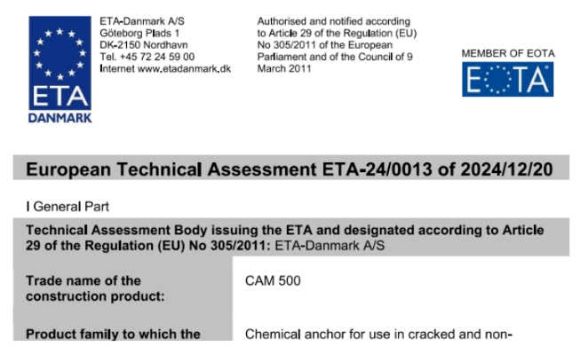 ETA是歐洲技術認可(European Technical Approval)的英文縮寫。ETA作為錨固行業的重要認證,它包含對樱桃视频在线下载的使用方法和係統規範性進行評估並驗證性能的恒定性,在全球範圍內認可度極高。